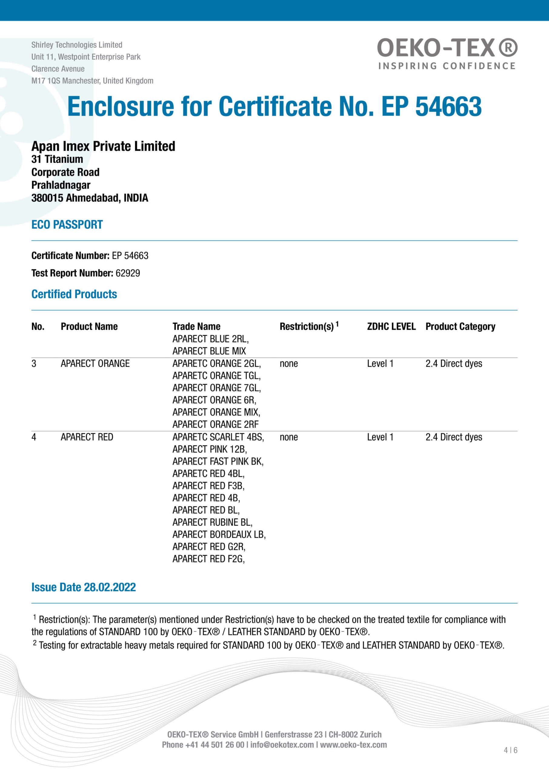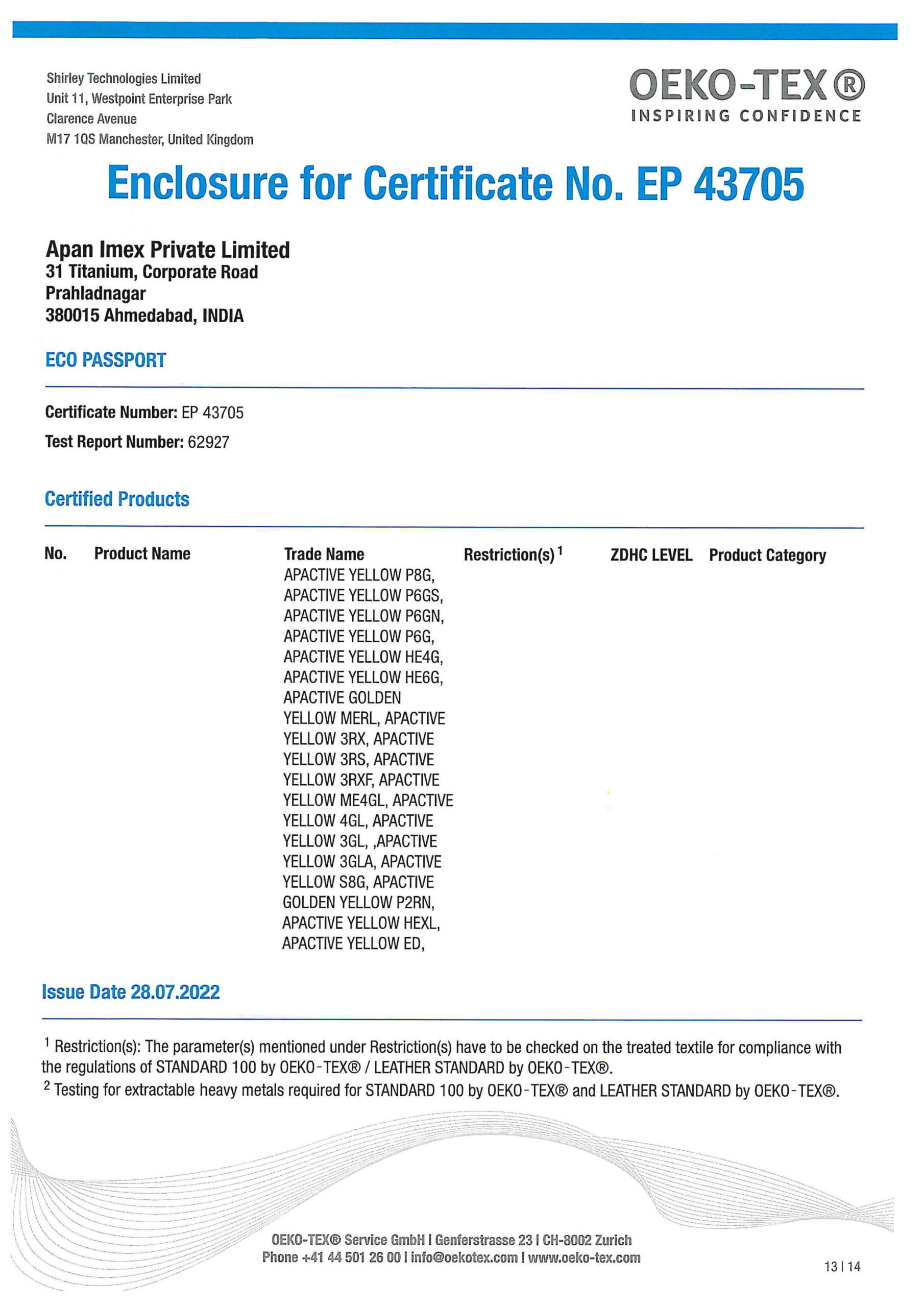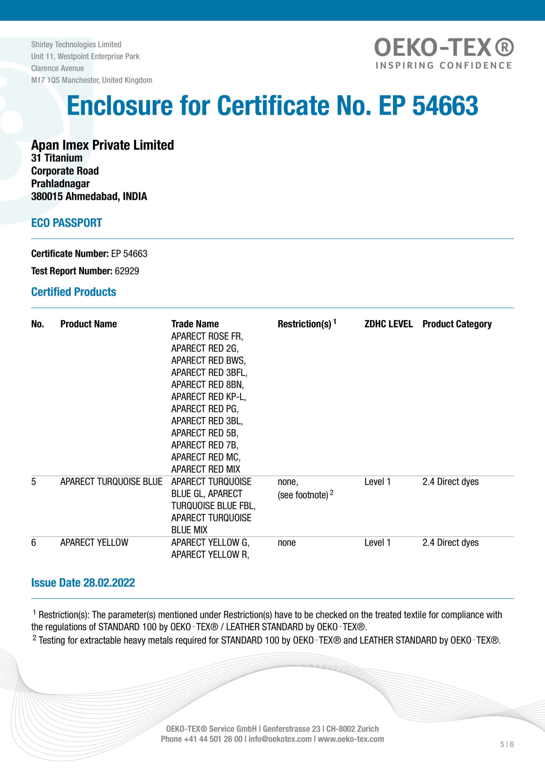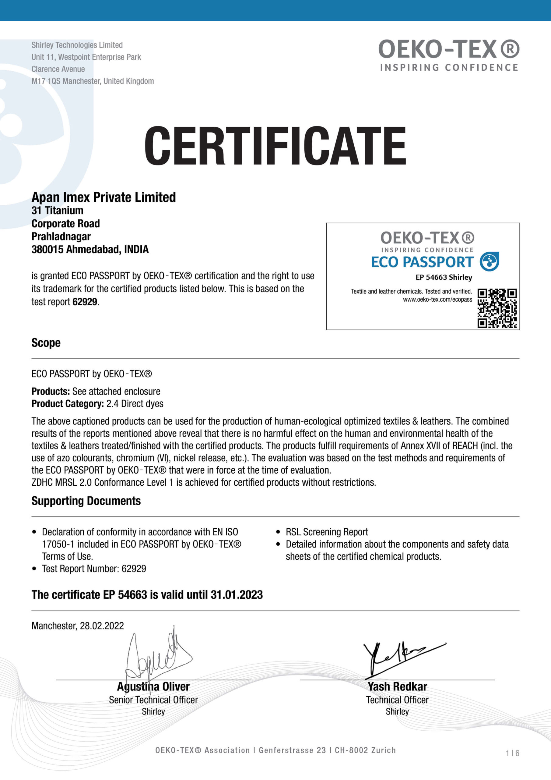 ECO PASSPORT CERTIFICATE DIRECT DYES