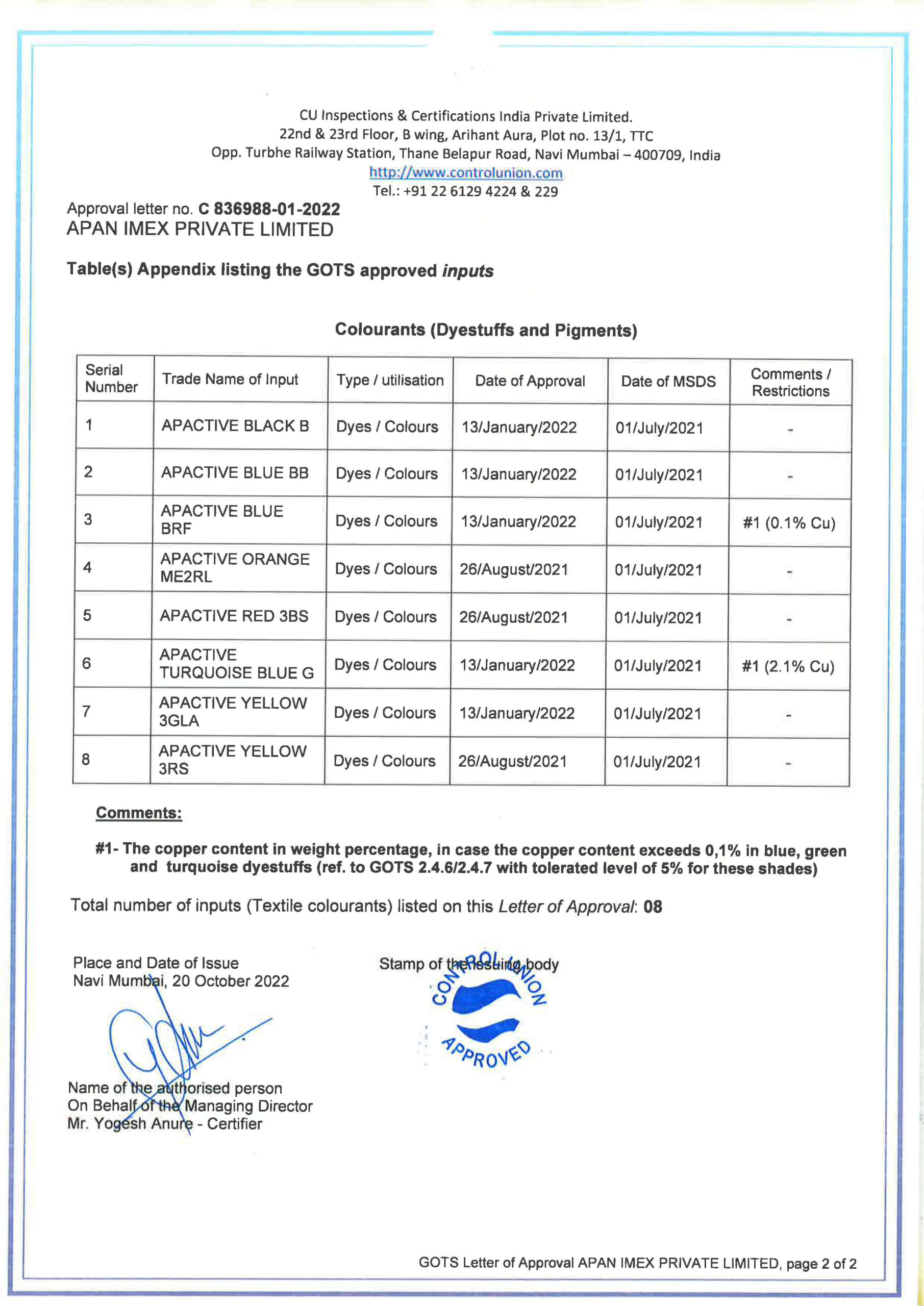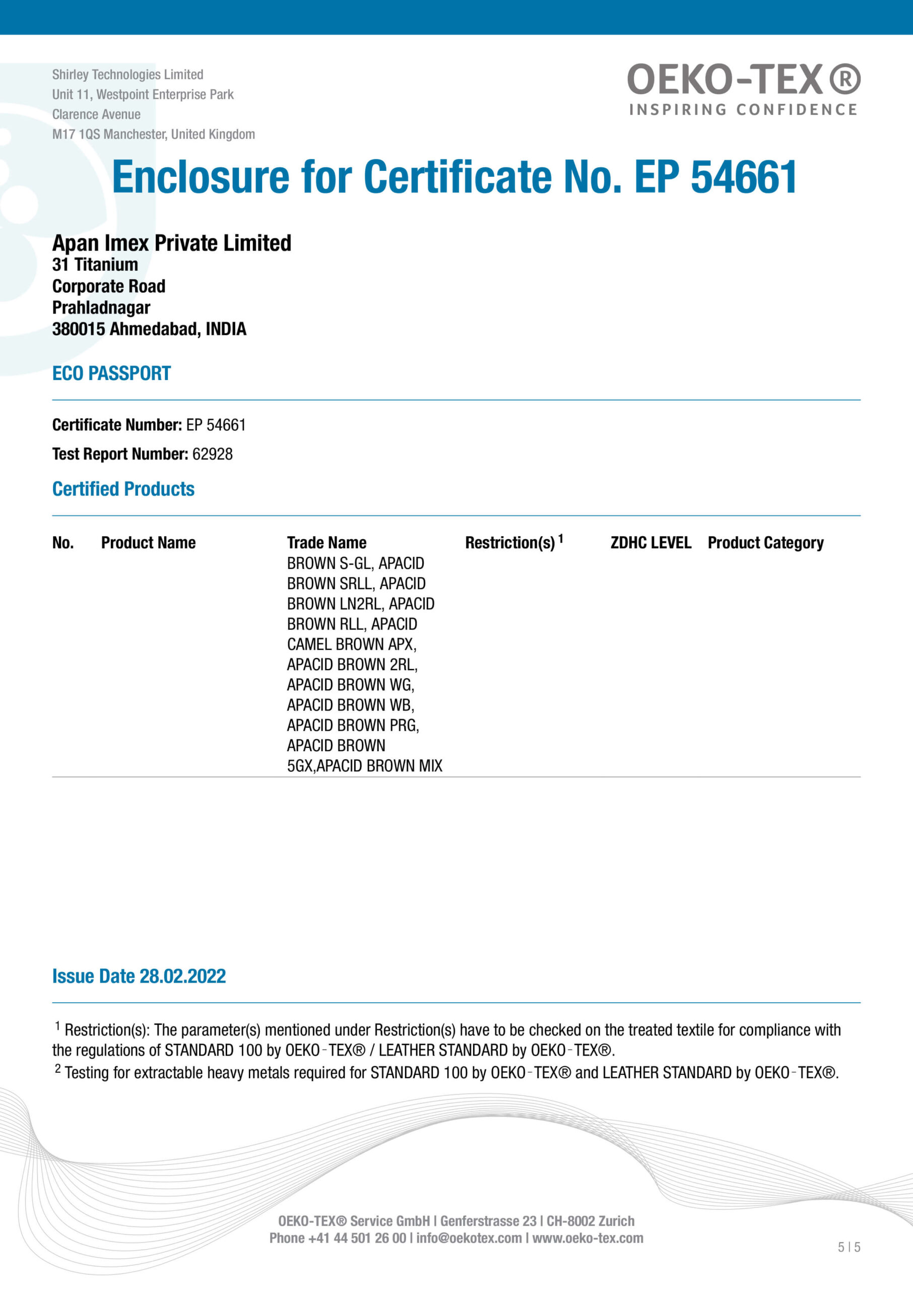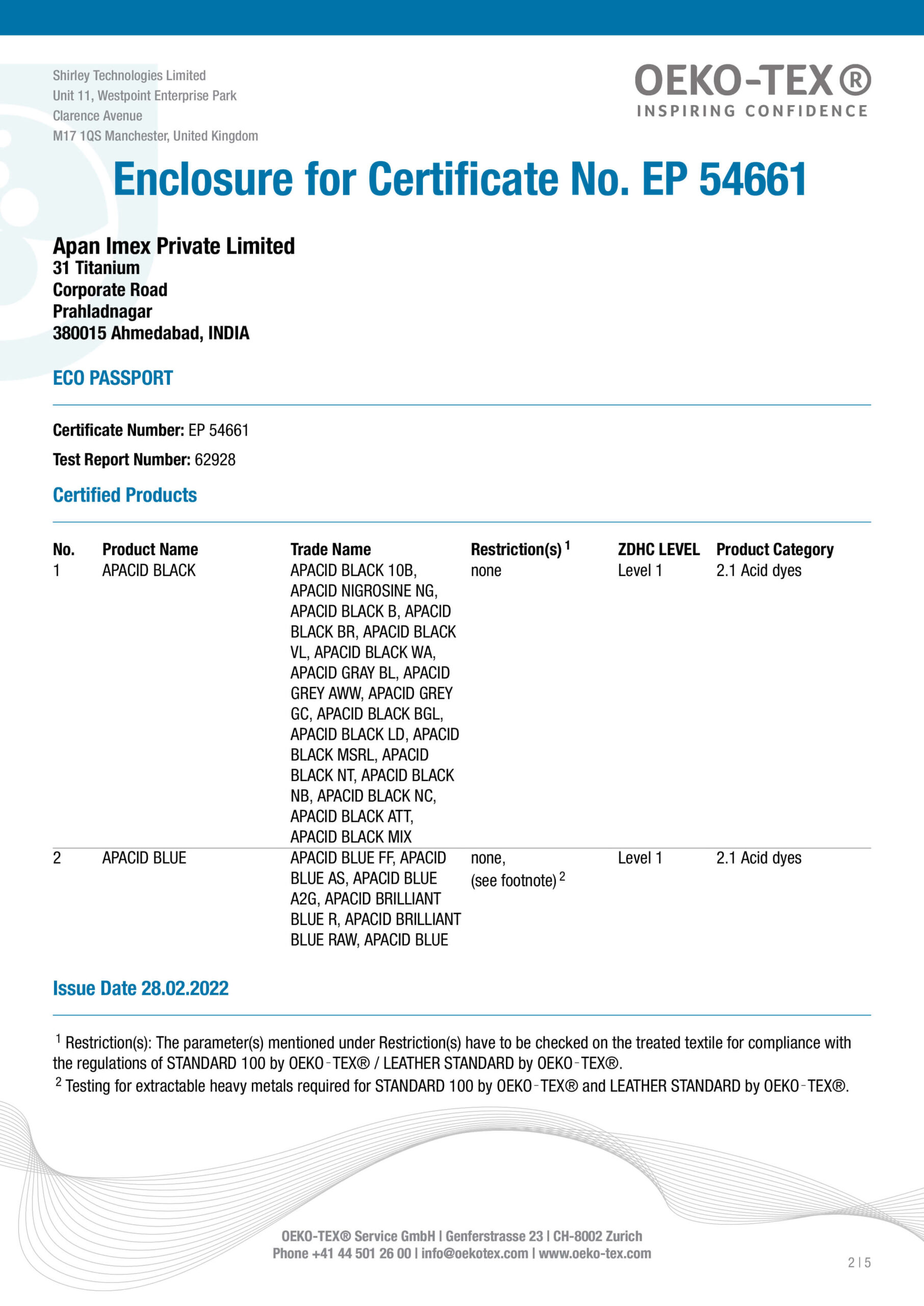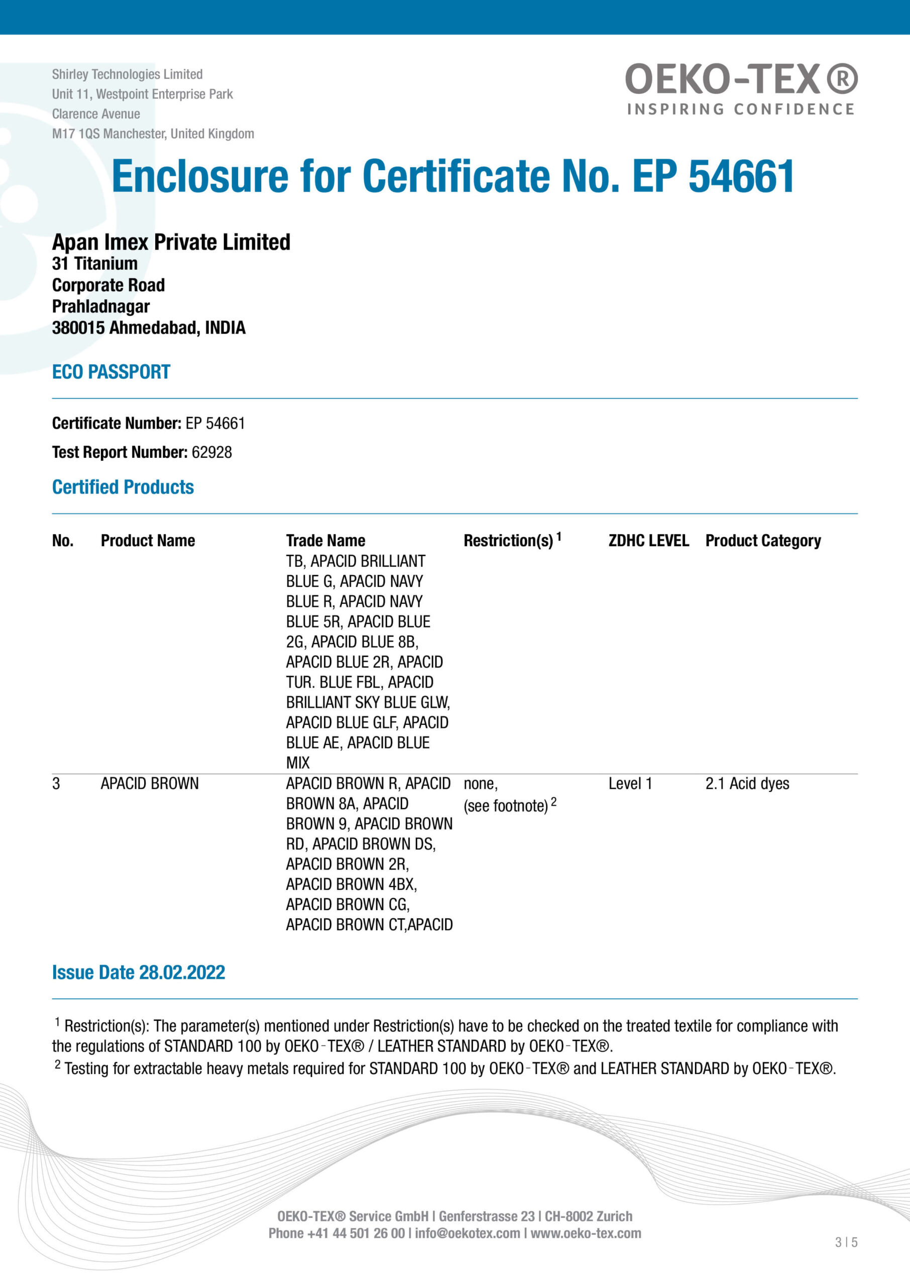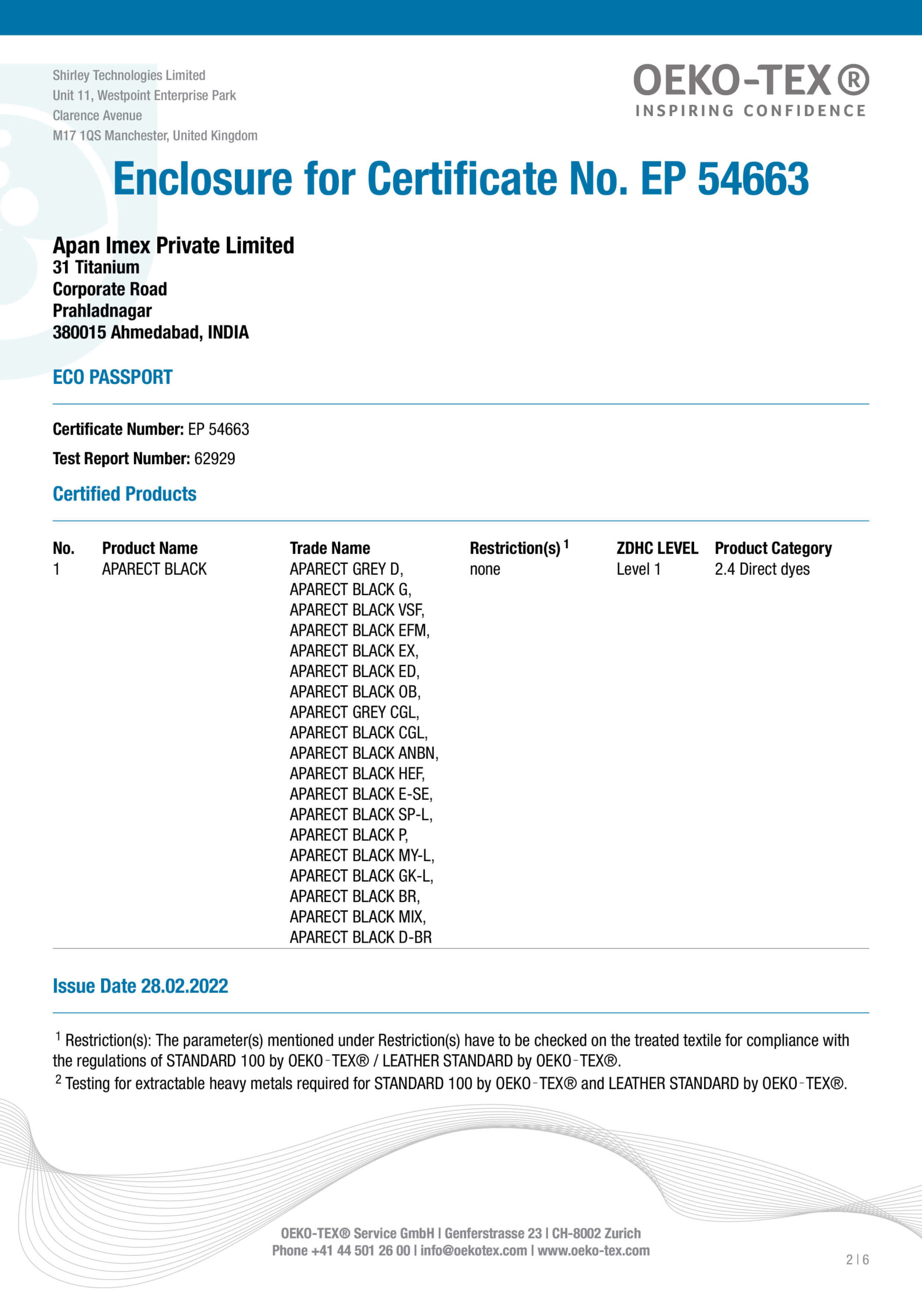 ECO PASSPORT CERTIFICATE DIRECT DYES