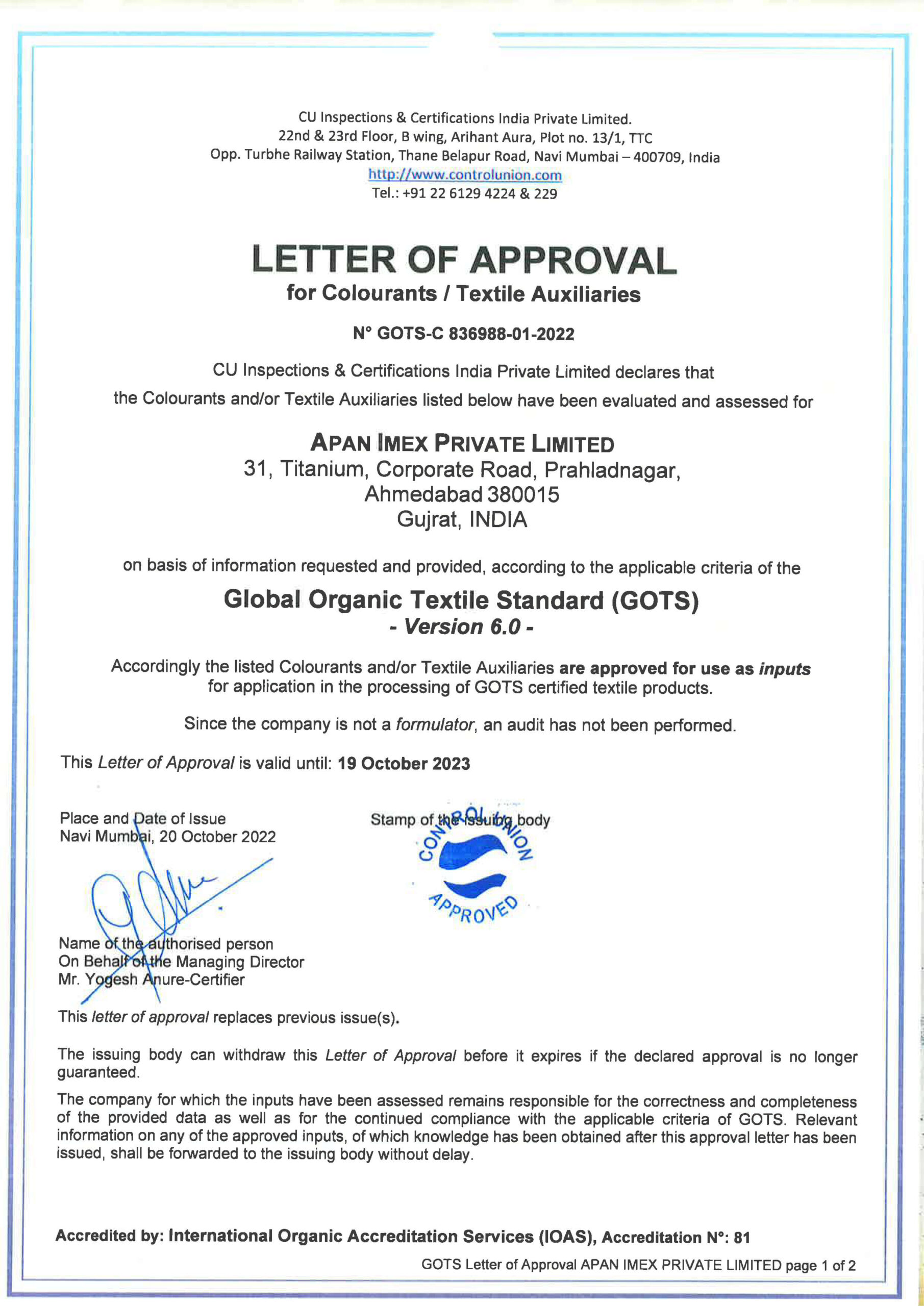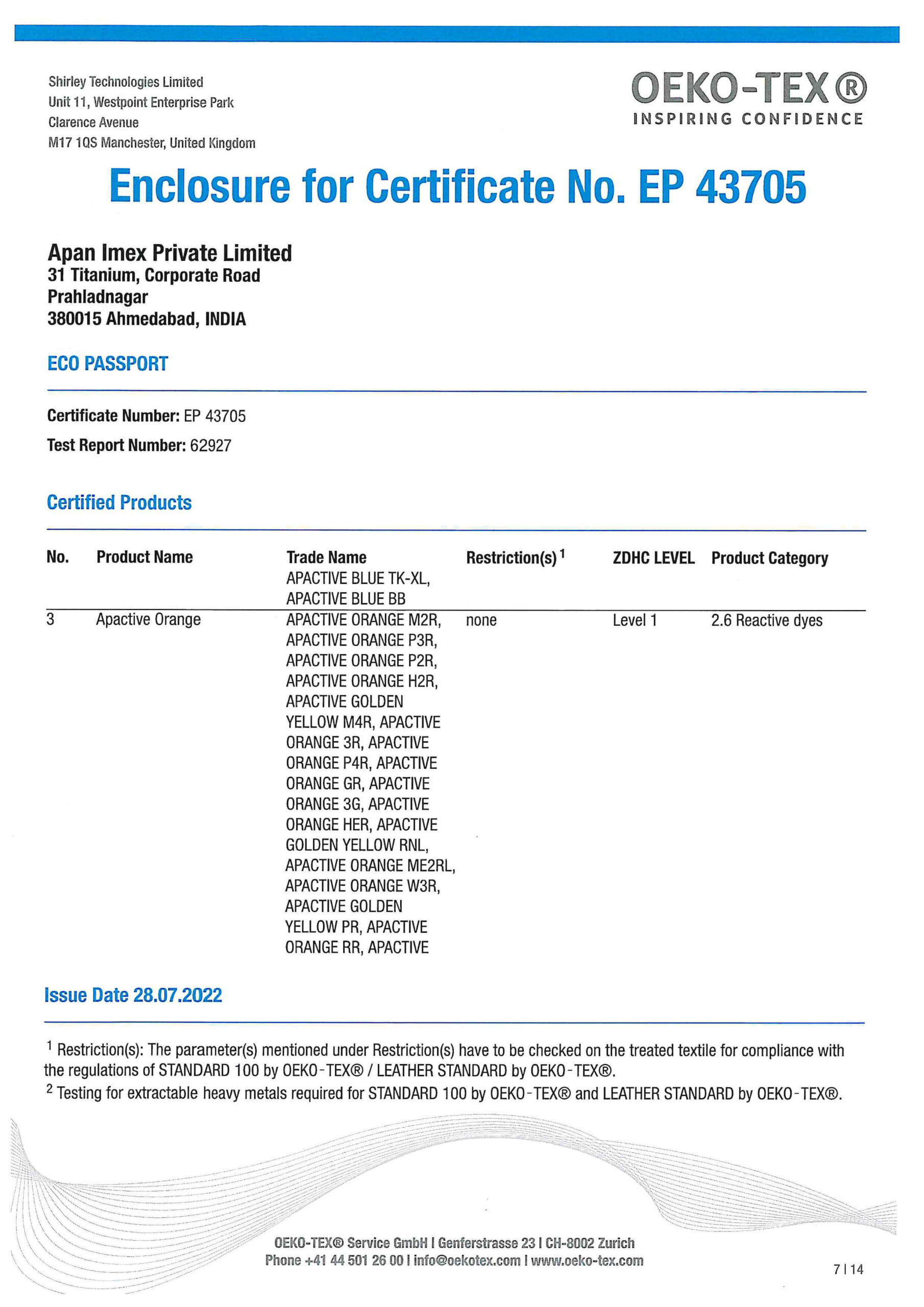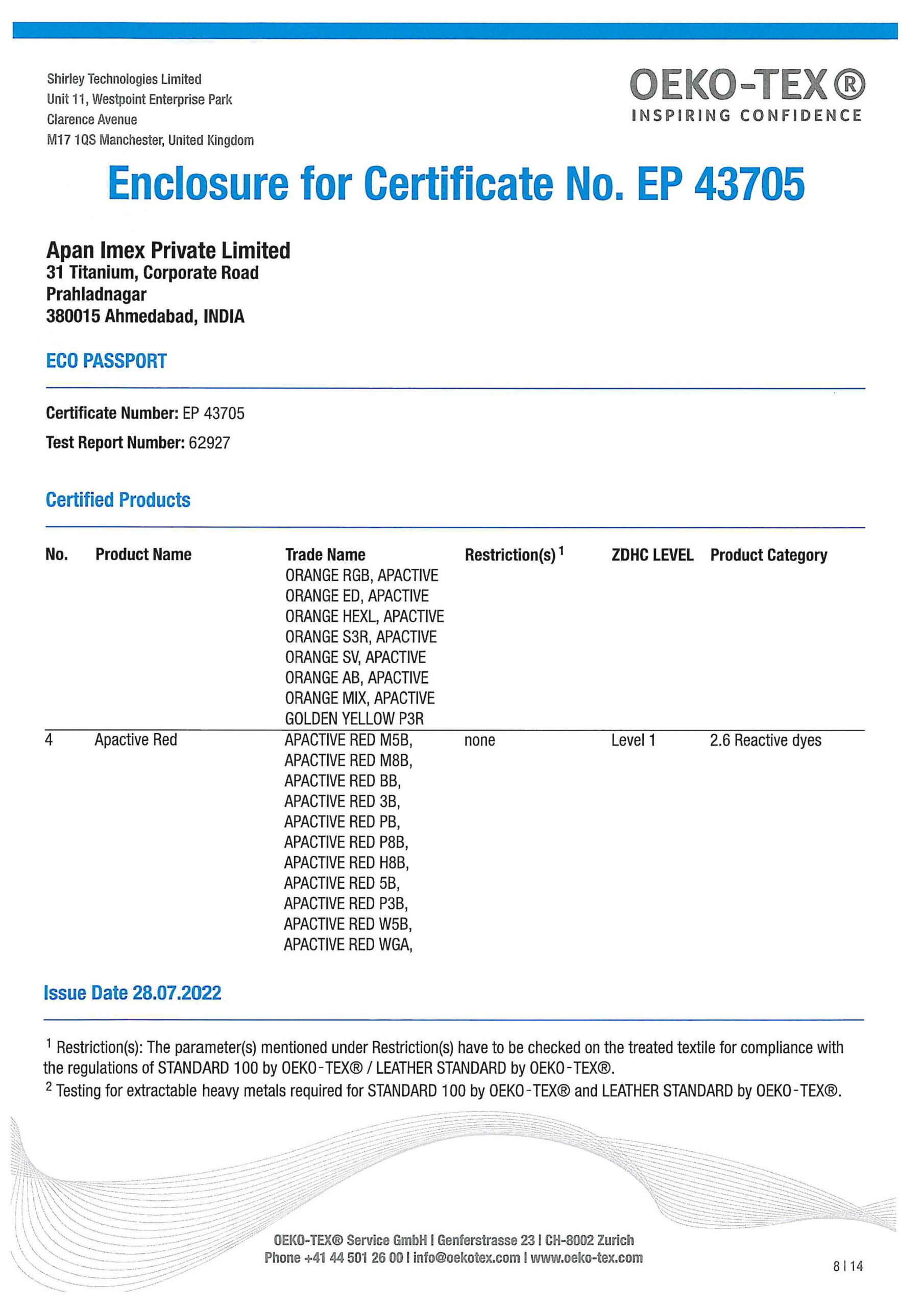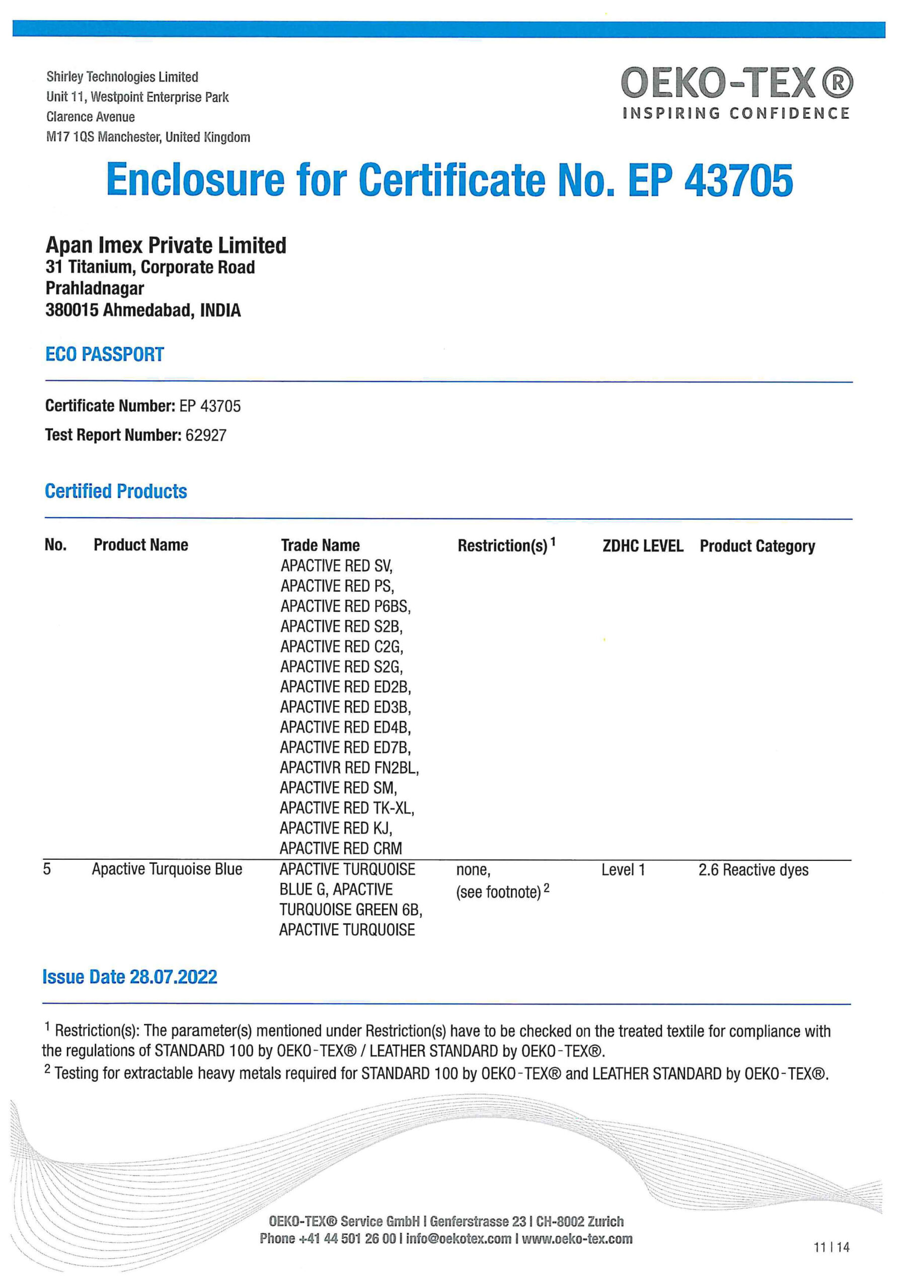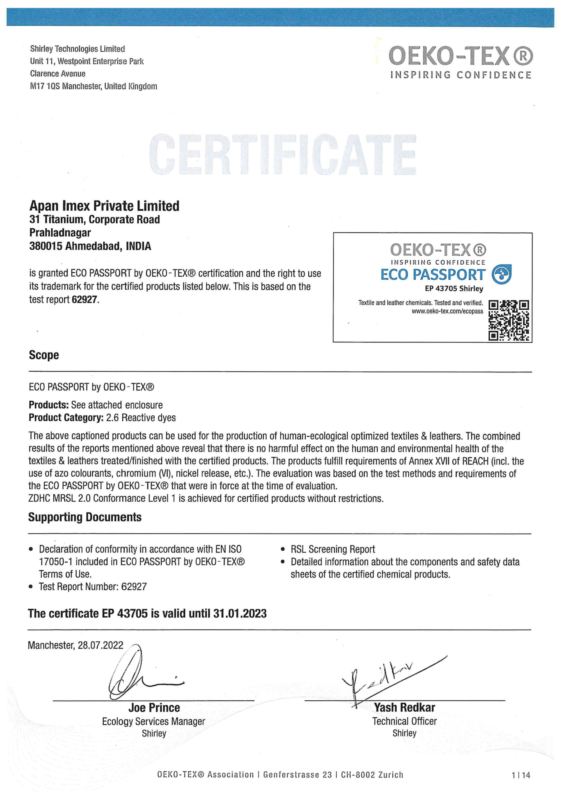 ECO PASSPORT CERTIFICATE REACTIVE DYES